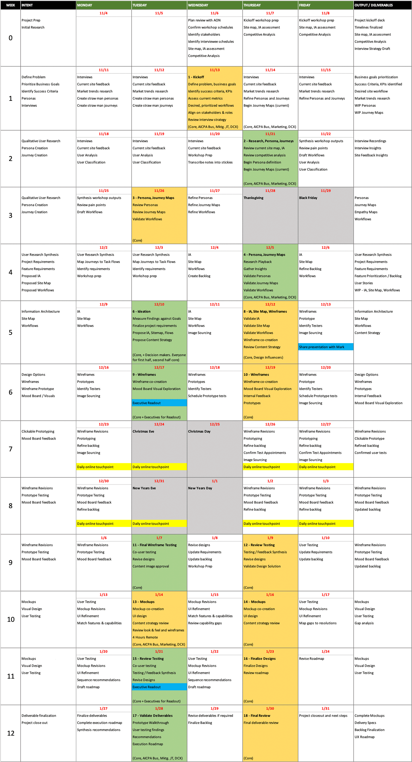 Project Strategy With a Mindtree and AON co-creation model, my collegue David (Mindtree insurance lead & program manager) and I laid out a 12 week consulting agenda, project scope, and deliverables schedule.