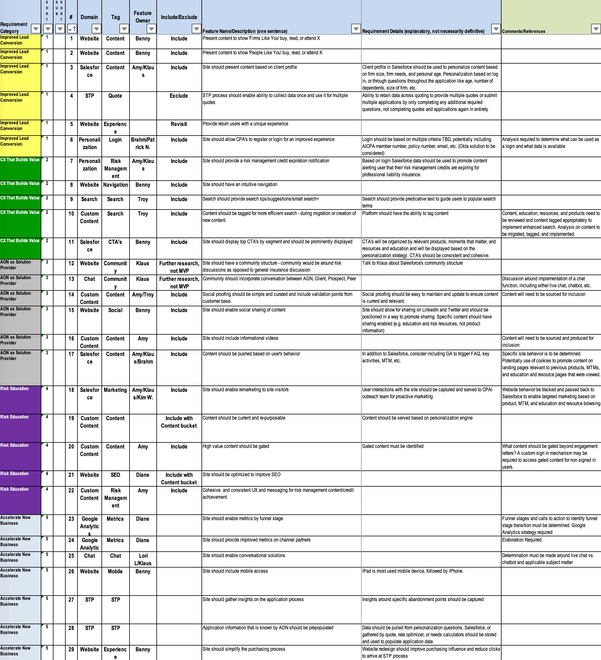 Based on our prioritization discussions, David compiled a requirements list, categorizing every feature/function type, such as lead conversion, customer experience value, solution provider, risk education, and new business acceleration. These features were ranked based on importance and level of execution effort, and tagged to either design or technical owners accountable for implementation.