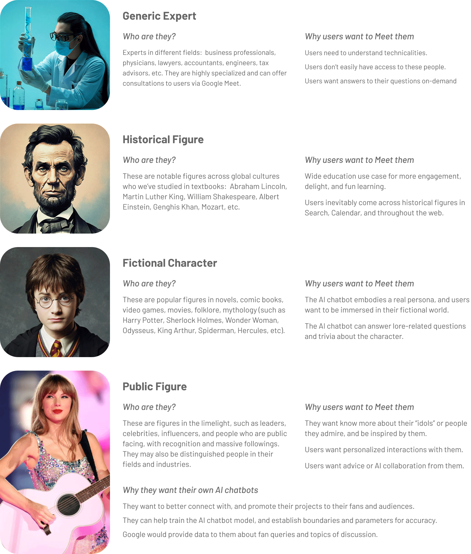 Below are the various types of AI chatbot personas that I am proposing users can invite to and interact with on a Google Meet call. There are further personas I have considered, but am not focusing on yet.