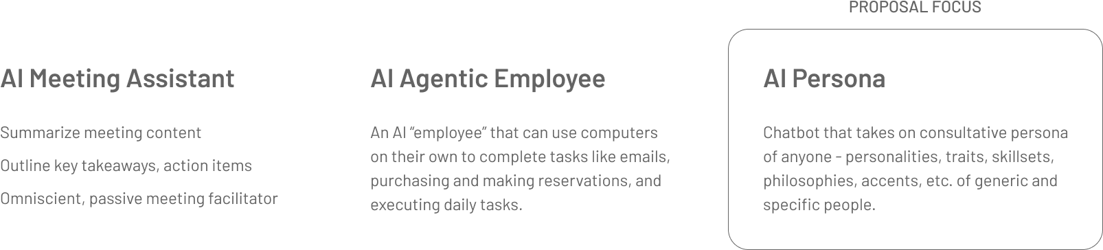 As of 2025, the term "AI agent" can refer to many chatbot types and functions, as shown below. This Meet Anyone proposal focuses on the AI Persona "consultants".