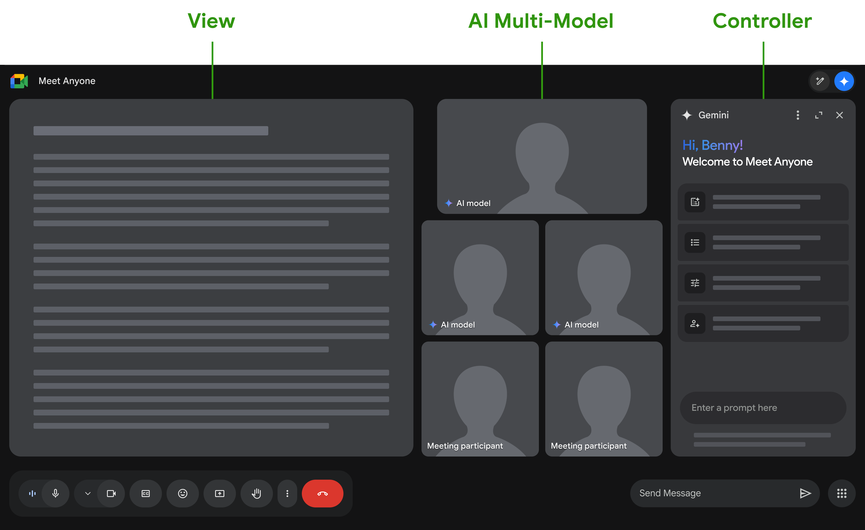 Meet Anyone will leverage existing Google Meet capabilities, fully accessing presentation views, dynamic layouts grid, and interactive Gemini AI side panel. Meet Anyone calls may not always utilize presentations, but the model and controller will always be present. Below is the proposed UI architecture for a Google Meet Anyone call.