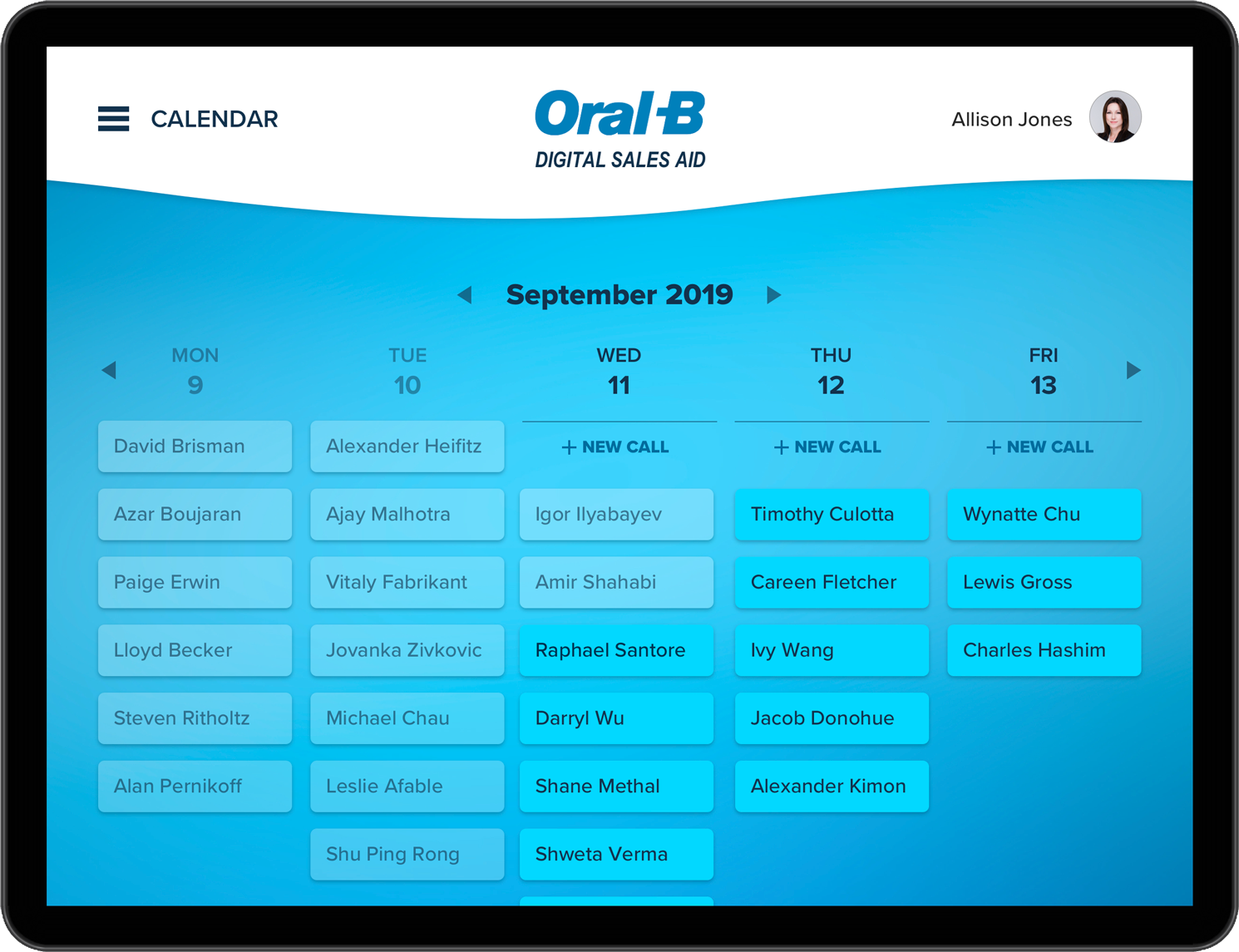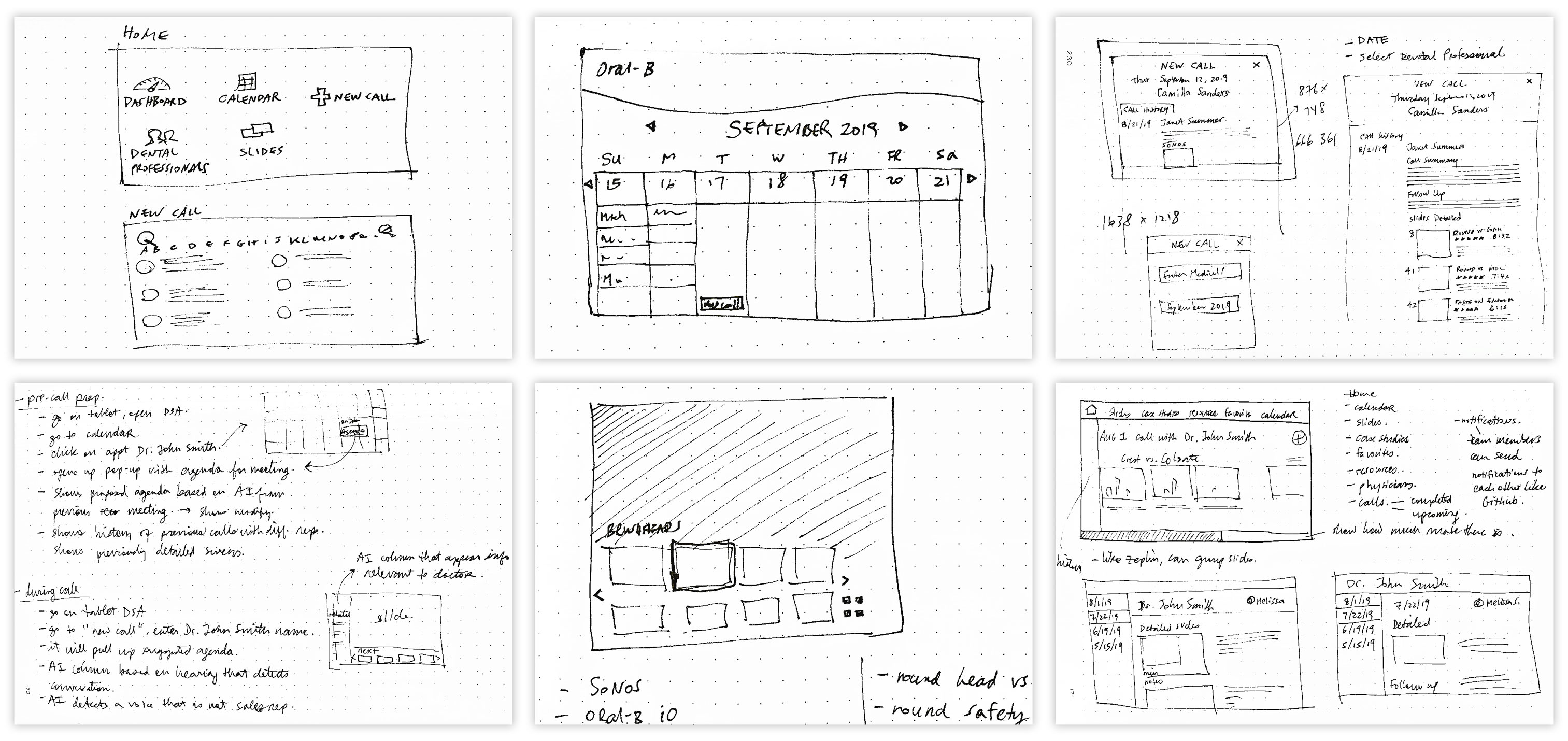 Early on, I sketched and shared possible designs with Jinto. Much of our conversations entailed accessing data from a Salesforce backend and displaying it in a custom designed interface. We talked through Javascript interactions, such as pop-up modals and swiping gestures. Since Oral-B sales reps use tablets to present their detail slides, Jinto and I agreed on an interactive tablet app that facilitated search, activity log, pre-call, in-call, and post-call planning.