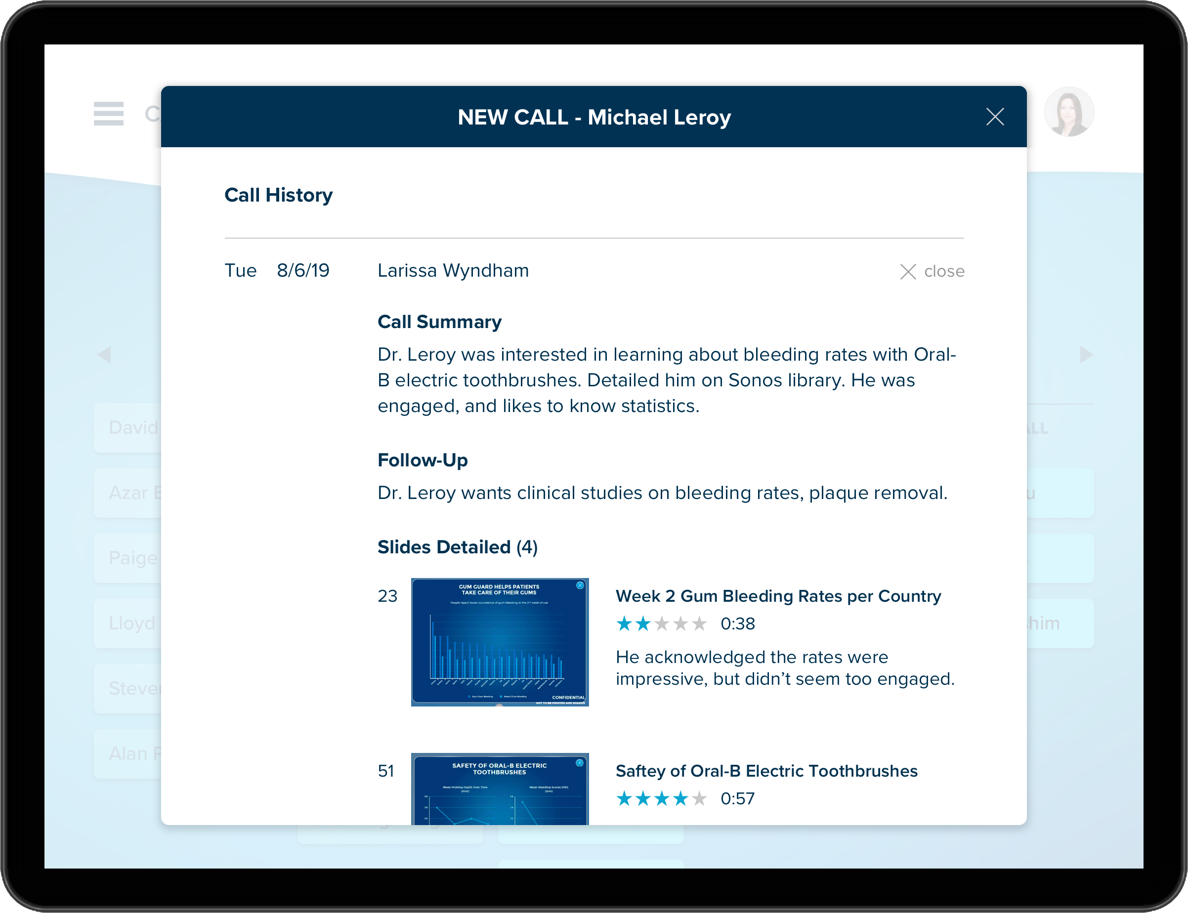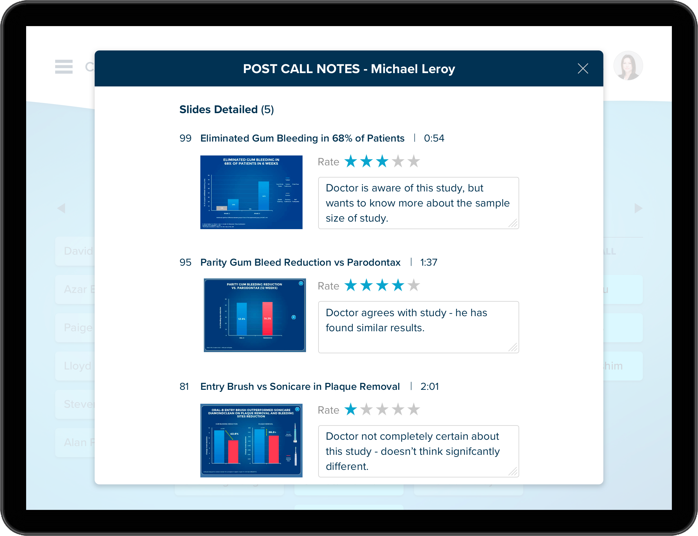 Slide Effectiveness Ratings Reps will be able to rate slides after each call, to determine relevance to the dental professional. Each slide will have an average rating.