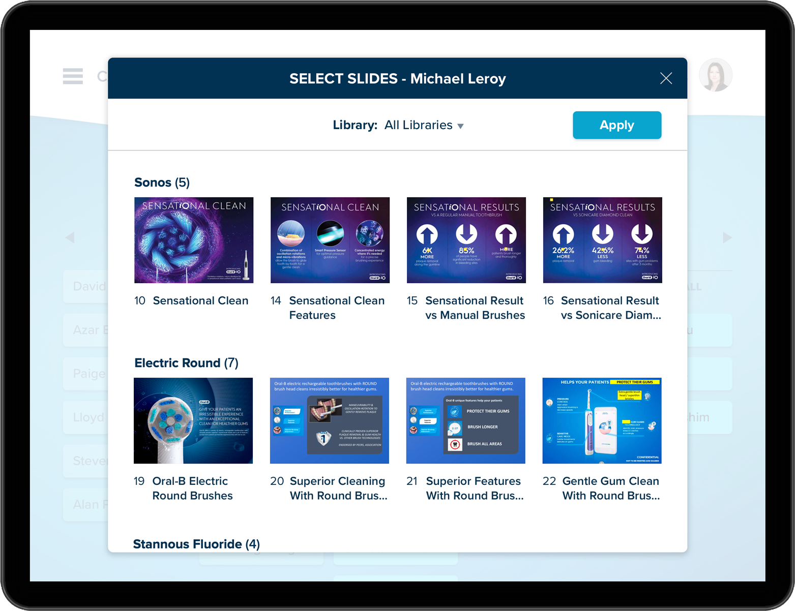 Customizable Slide Presentations Reps will be able to compile their own 'story arc' and apply them to relevant dental professionals.