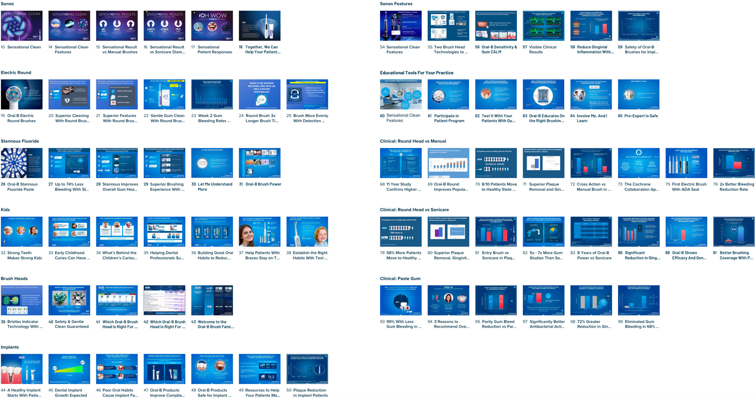 Oral-B shared samples of their 100+ slides (as shown below) used by sales reps to detail dental professionals. Since the project brief was to redesign the slides, I examined each slide from different story arcs to identify new possibilities.