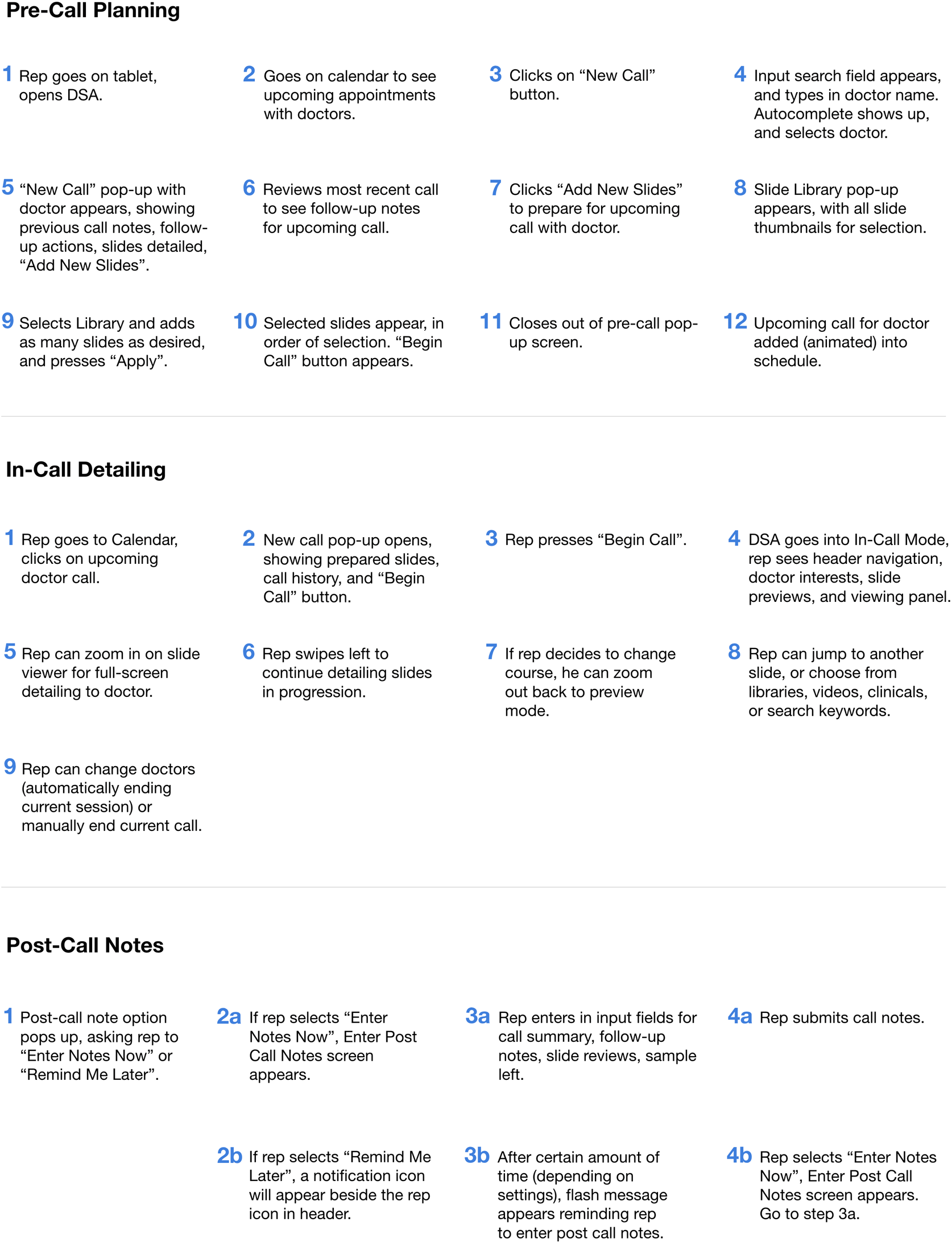 Based on these interview and research findings, I envisioned and proposed new sales rep workflows for pre-call planning, in-call detailing, and post-call note entry, as shown below.