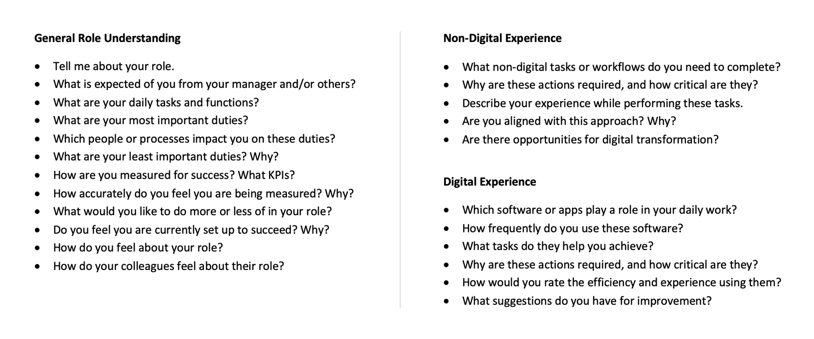I observed and listened to sales reps' presentations, and also asked about their experience with the PDF slides, pain points, and suggestions for improvement. I also spoke with sales managers to consider their needs. Below are my interview questions, and key themes and insights I identified for both user groups.