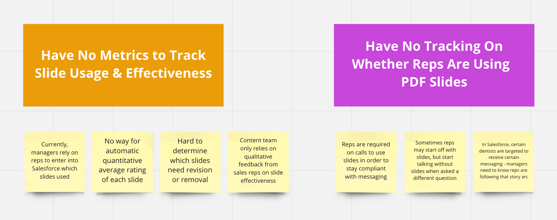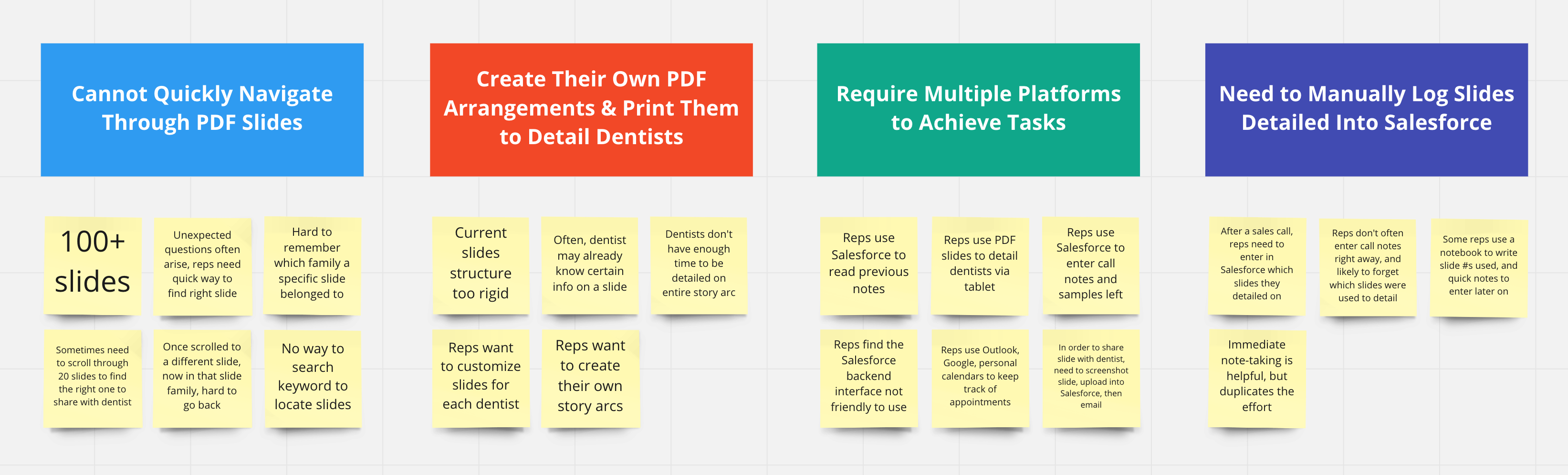 After evaluating both sales reps and managers' viewpoints, it became apparent to me that the more immediate need was designing an application architecture that enabled flexible slide detailing, as well as automated slide usage detection, instead of merely redesigning the slide visuals. Most sales reps were not as concerned with the slide quality. I brought this recommendation to Oral-B stakeholders, and they were aligned to this pivot.