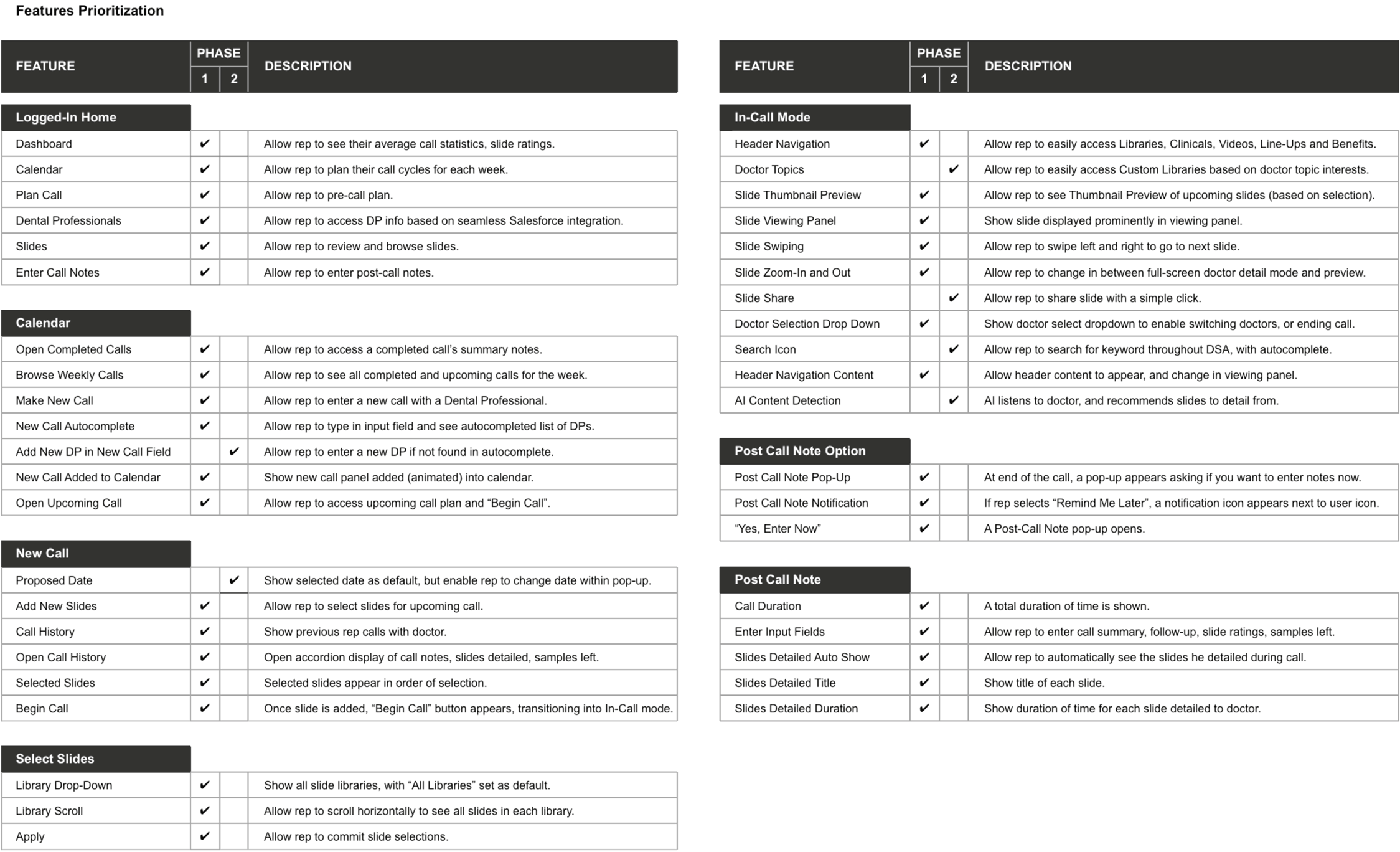 Once Oral-B stakeholders were bought in and aligned with my team's vision in these future state journeys, we defined prioritized features and requirements for the Digital Sales Aid MVP product, as shown below: