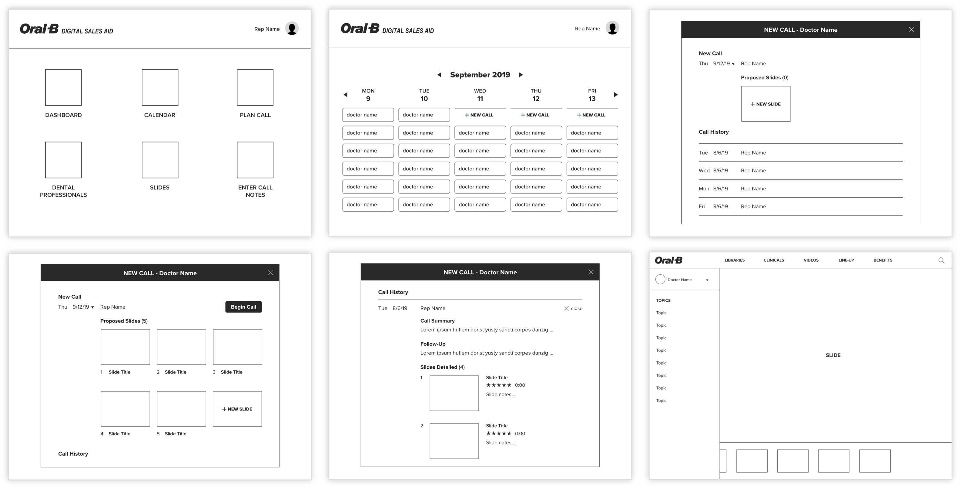 Once Jinto and I aligned on high-level design layouts, I created low fidelity wireframes to share with Oral-B stakeholders and sales reps. They offered suggestions and revisions, and after numerous workflow iterations, we defined the MVP product architecture. I then began designing a mid fidelity prototype.