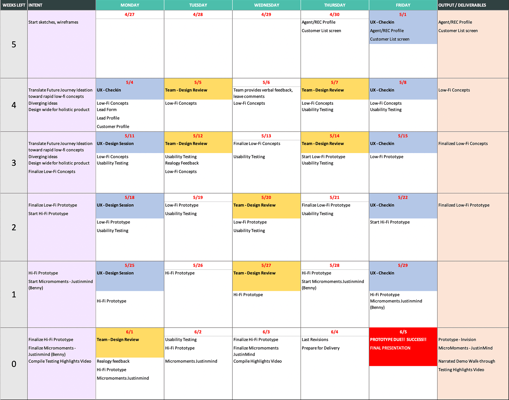 By the fifth week in the 9 week Referral Platform project, we had completed client goals identification, existing platform analyses, pain points documentation, and requirements gathering. Since we were now entering the product design phase, I created and defined the prototype roadmap (as shown below), setting daily agenda, reviews schedule, and deliverable milestones.